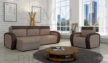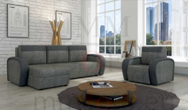 Zestaw wypoczynkowy składający się z narożnika i fotela. Idealny zestaw dla osób ceniących wygodę.Elementem wyróżniającym jest ozdobna wstawka na bokach i poduchach. Wykonany jest w całości na sprężynach bonelowych co zapewnia komfort spania.Natomiast w fotelu wypełnienie siedziska stanowi sprężyna falista o podwyższonym standardzie i pianka. Narożnik posiada dwa pojemniki na pościel i funkcję spania typu DL z wspomaganiem otwierania.